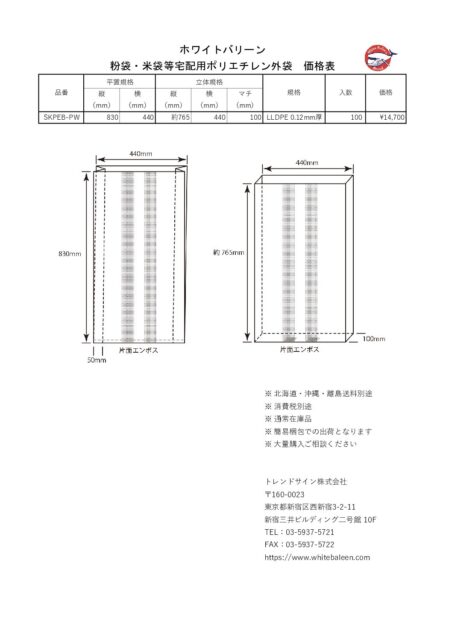 | SKPEB-PW | 830 x 440 | 約765 x 440 x 100 | 0.12mm厚 LLDPE | 100 |